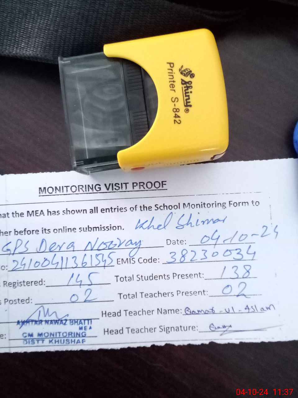 | Attendance Register | Head Teacher | MEA with School | Visit Proof |