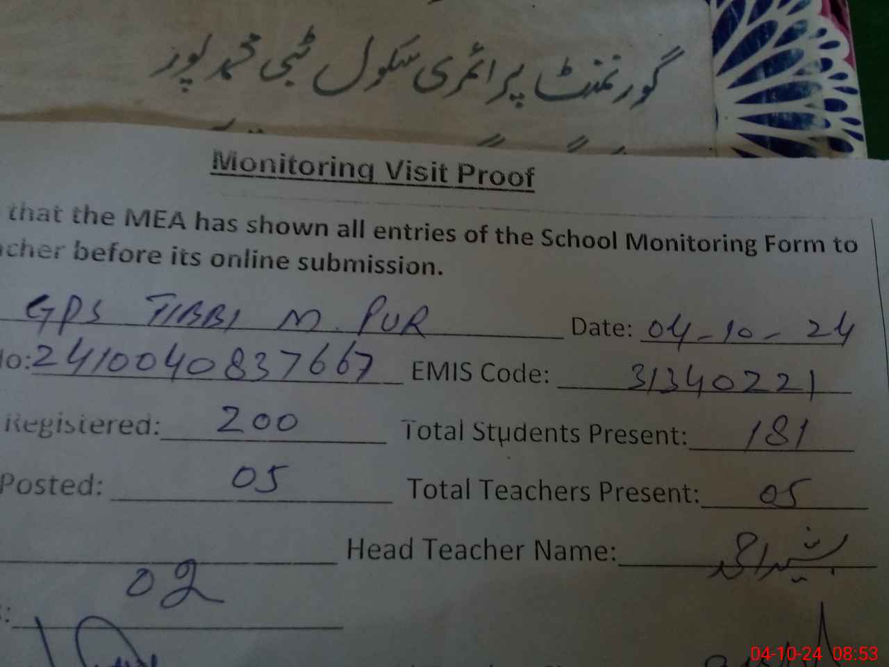 | EMIS Code: 31340221 | Name of School: GPS TIBBI MUHAMMAD PUR | |||