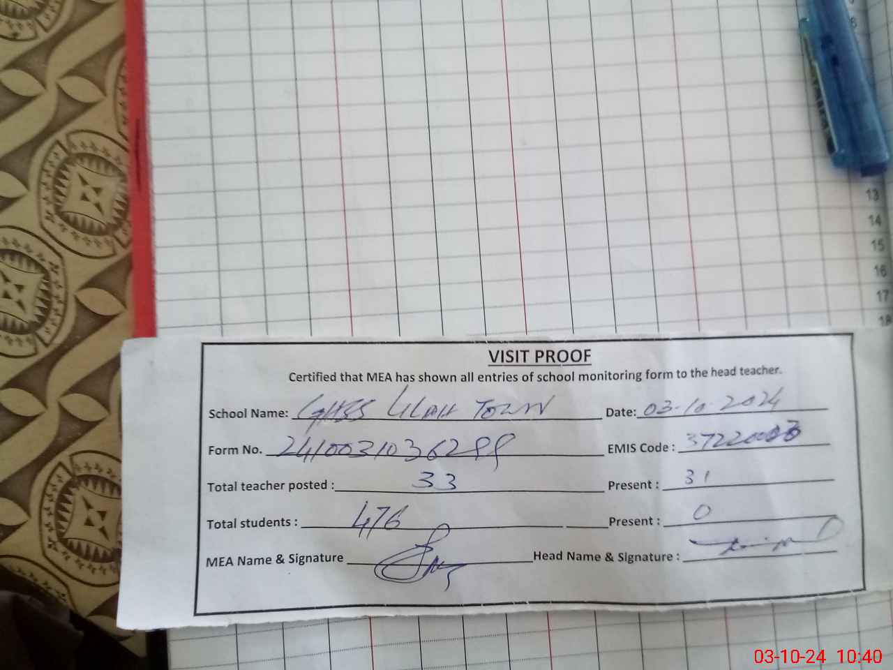 | Attendance Register | Head Teacher | MEA with School | Visit Proof |