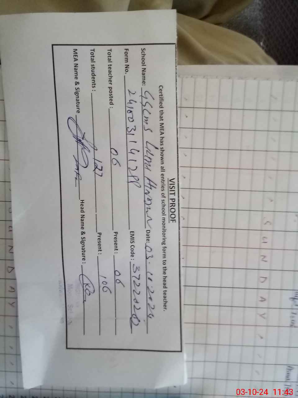 | Attendance Register | Head Teacher | MEA with School | Visit Proof |