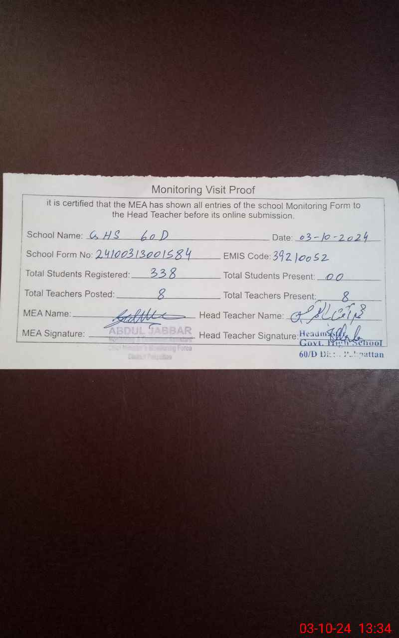 | EMIS Code: 39210052 | Name of School: GHS 60/D P/O CHAK BADIA | |||