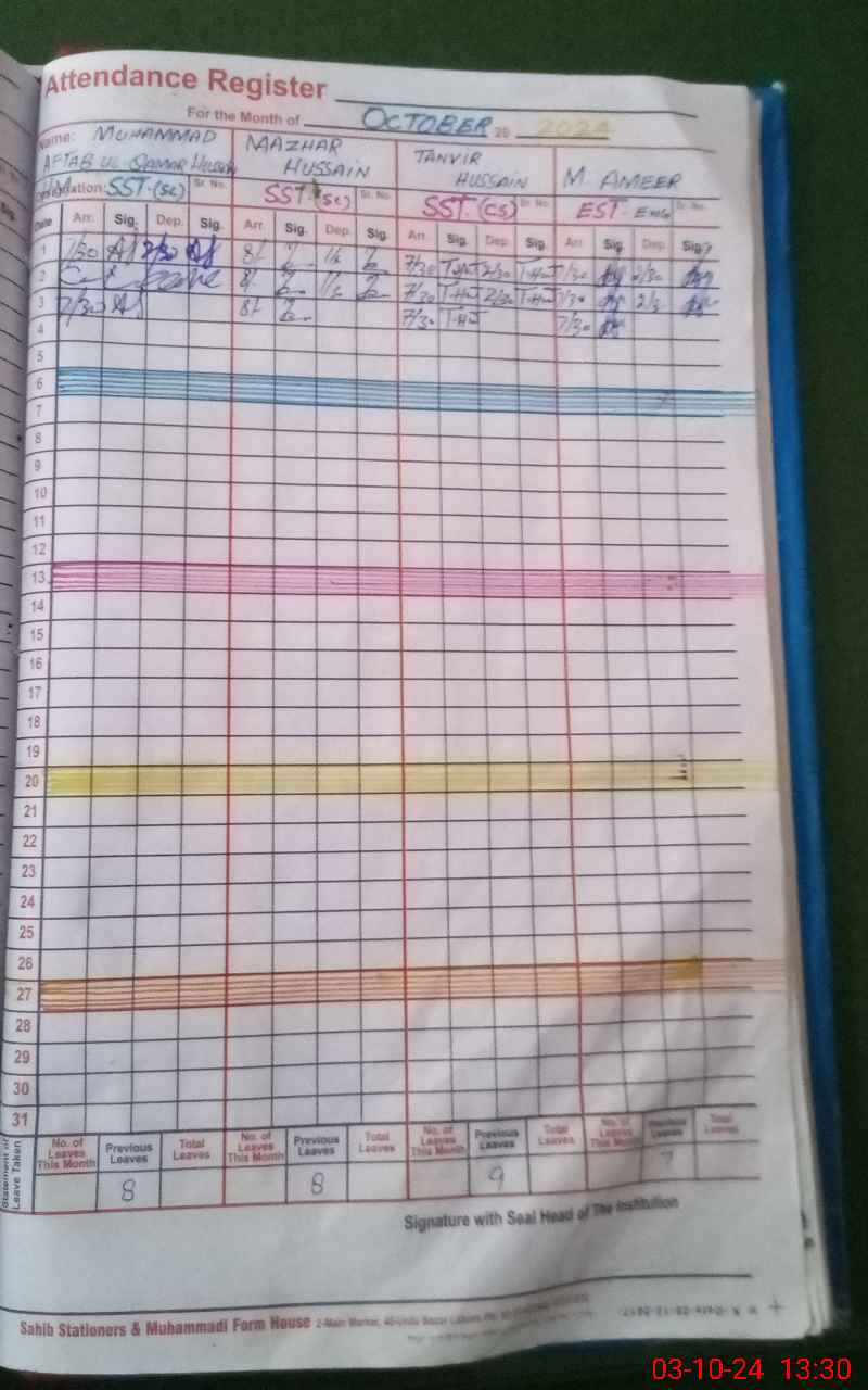 | CNIC | Full Name | Designation | R/C | Absence During Last Calender Month |