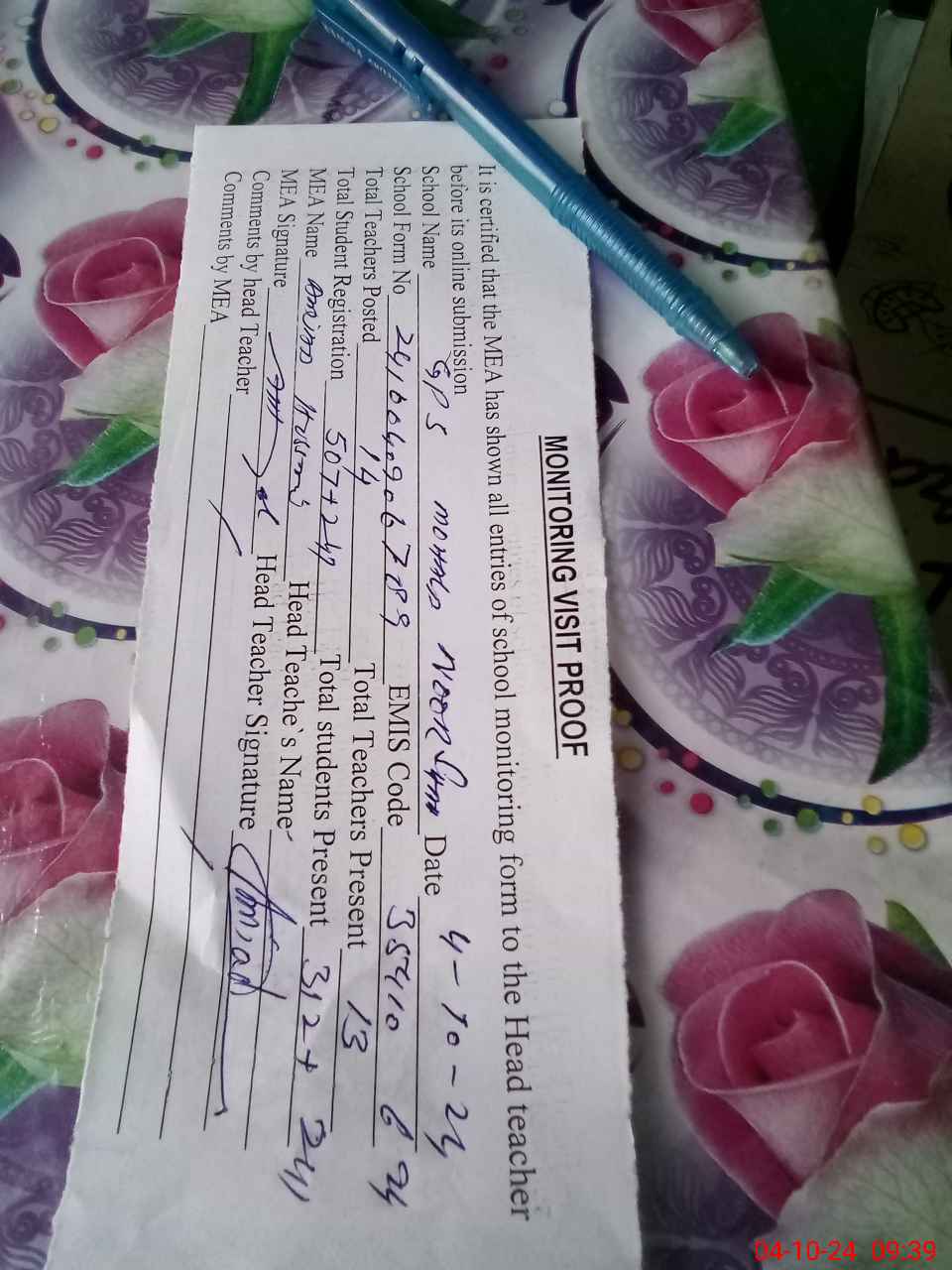 | Attendance Register | Head Teacher | MEA with School | Visit Proof |