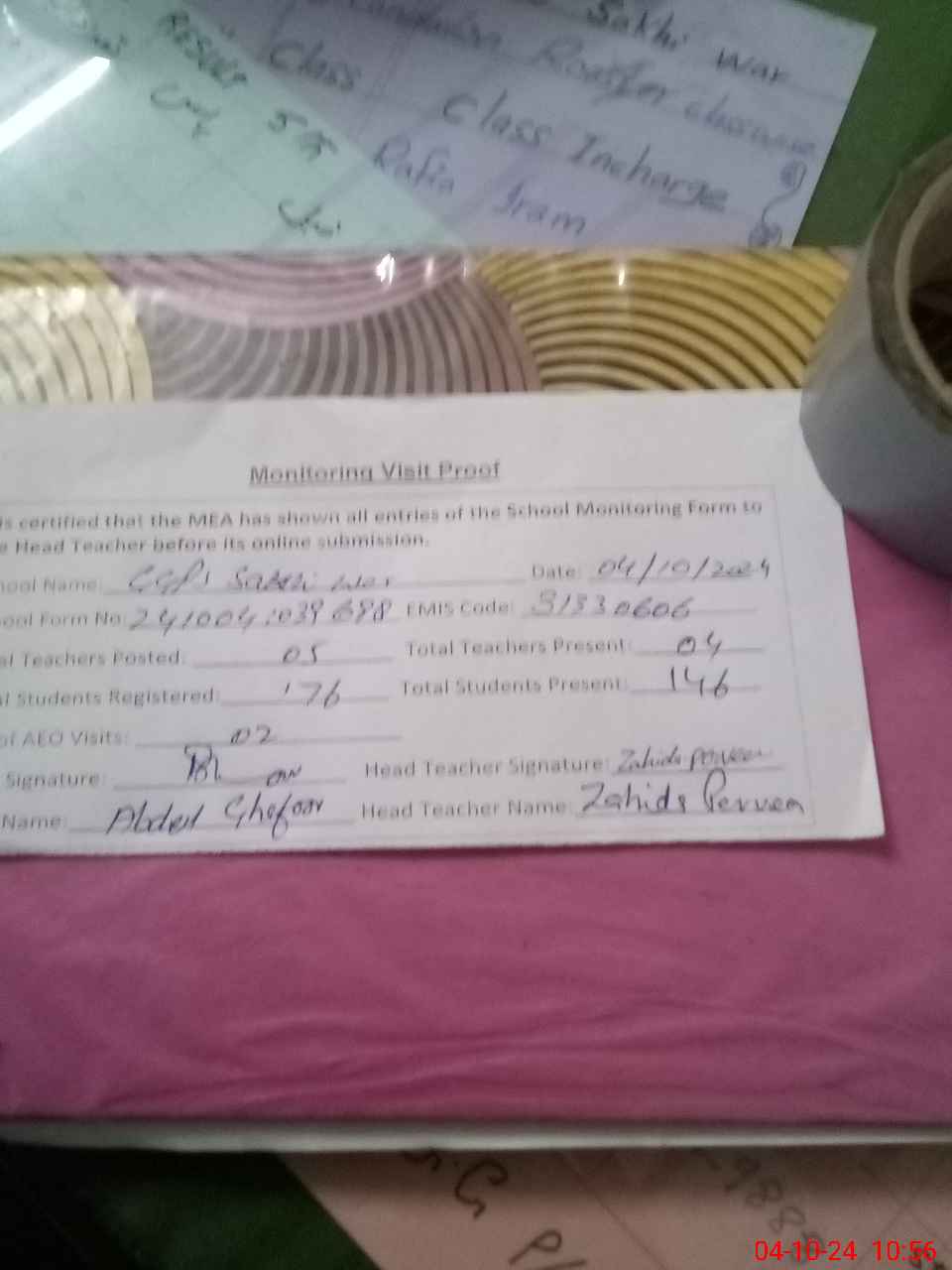| Attendance Register | Head Teacher | MEA with School | Visit Proof |