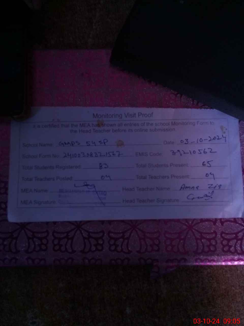 | Attendance Register | Head Teacher | MEA with School | Visit Proof |