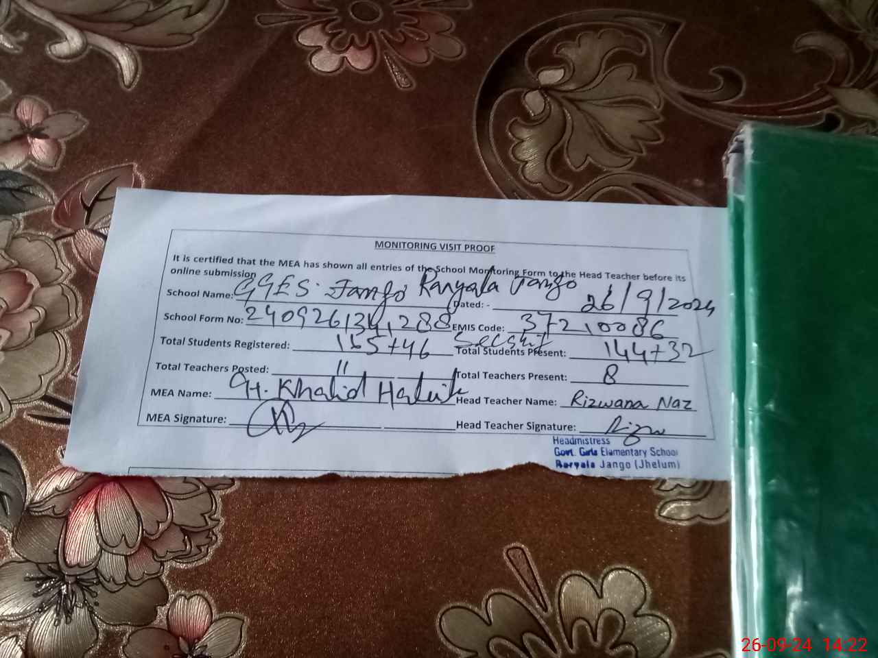 | Certified that this School was Inspected by the Undersigned MEA/DMO Today and the Information Stated Above is as Per Record. | |||||