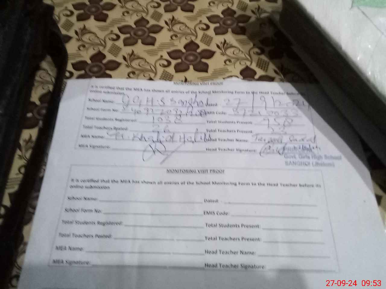 | Monitoring Date: 27-09-2024 | Start Time: 27-09-2024 09:20 AM | End Time: 27-09-2024 09:55 AM | Name of MEA: Kh**** ha**** | |