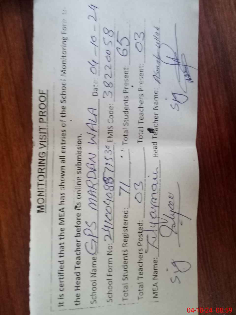 | Attendance Register | Head Teacher | MEA with School | Visit Proof |