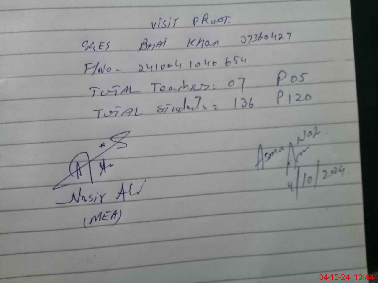 | Name: As**** Na**** Designation: (School Headmaster's/Headmistress's) Est Phone/Cell Number: 03**** |