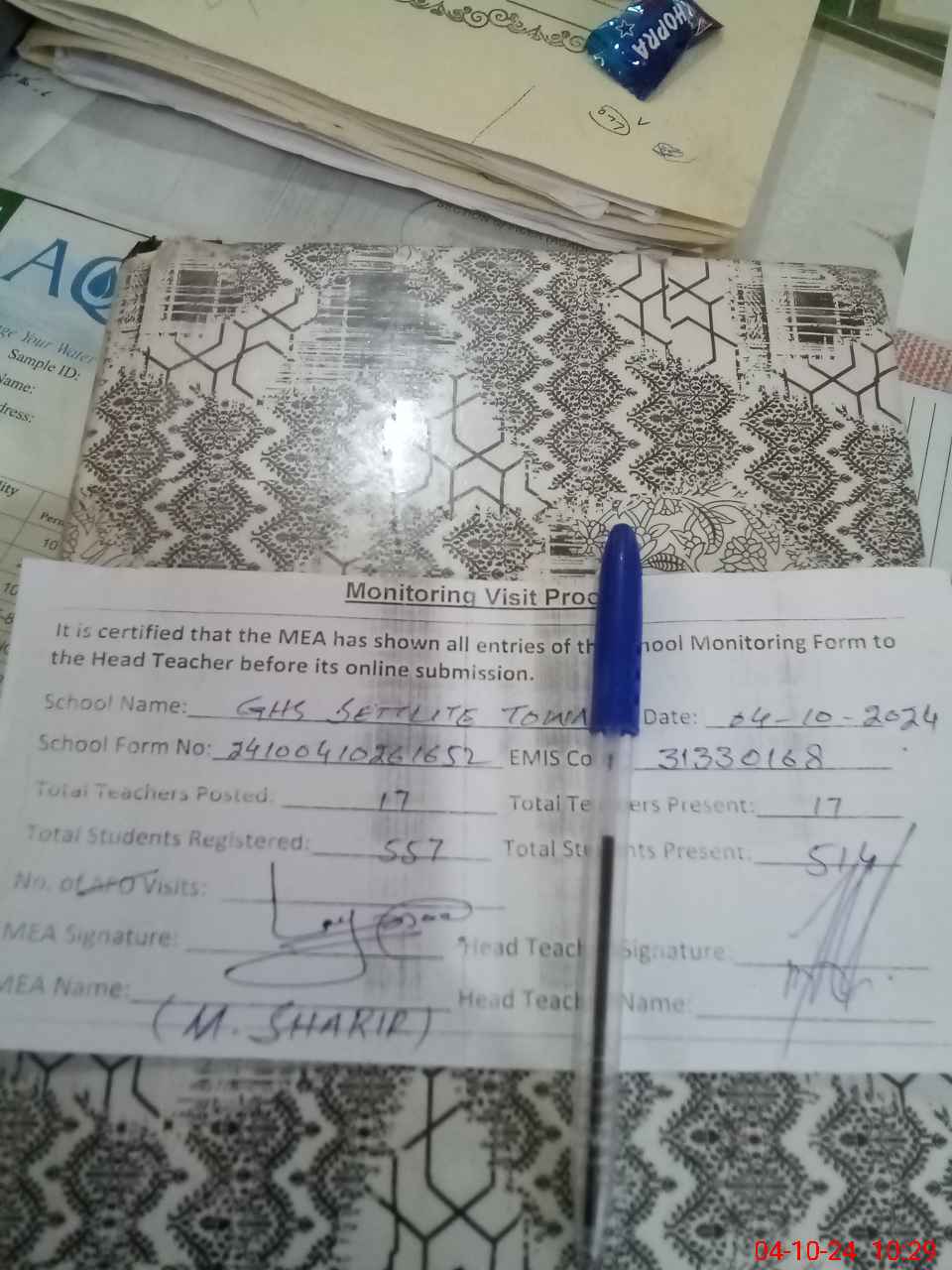 | Attendance Register | Head Teacher | MEA with School | Visit Proof |