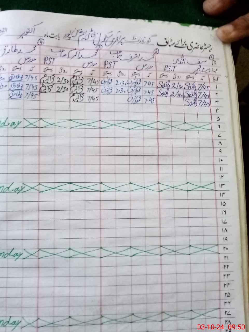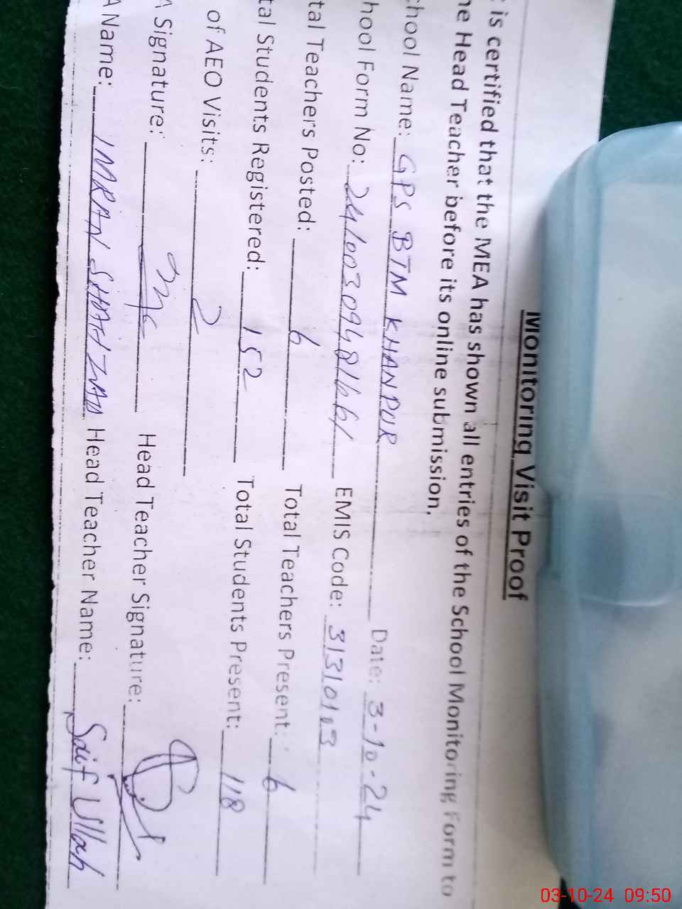 | Name: MA**** NA**** Designation: (School Headmaster's/Headmistress's) PST Phone/Cell Number: 03**** |