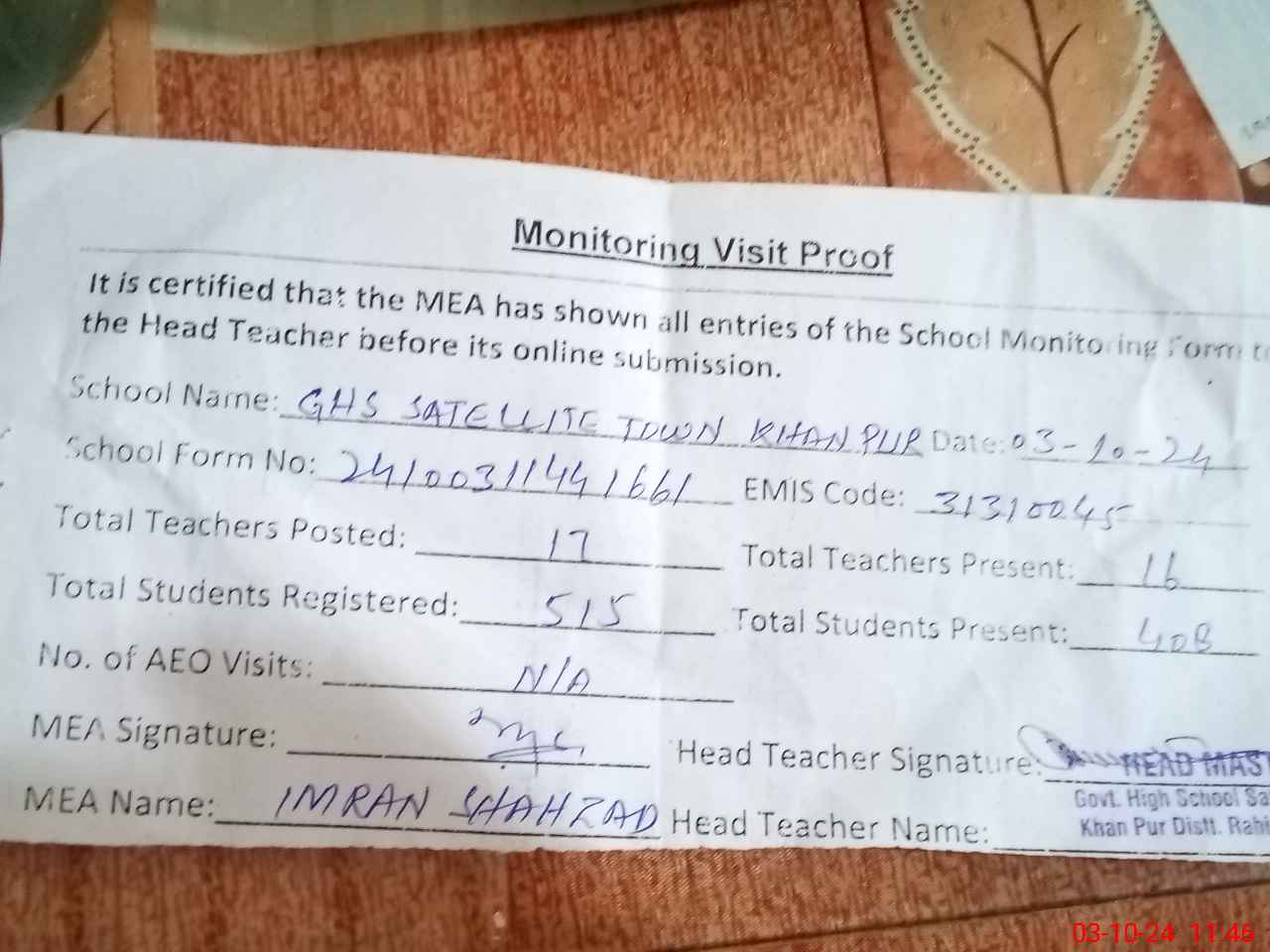 | EMIS Code: 31310045 | Name of School: GHS SATELLITE TOWN KHANPUR | |||