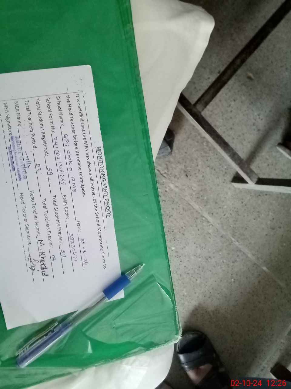 | Attendance Register | Head Teacher | MEA with School | Visit Proof |
