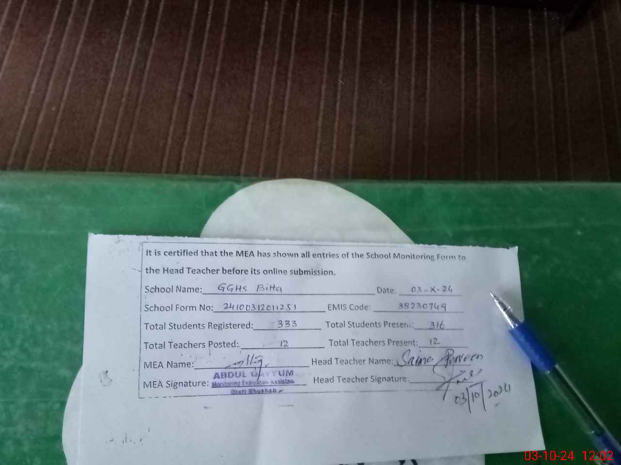| Certified that this School was Inspected by the Undersigned MEA/DMO Today and the Information Stated Above is as Per Record. | |||||