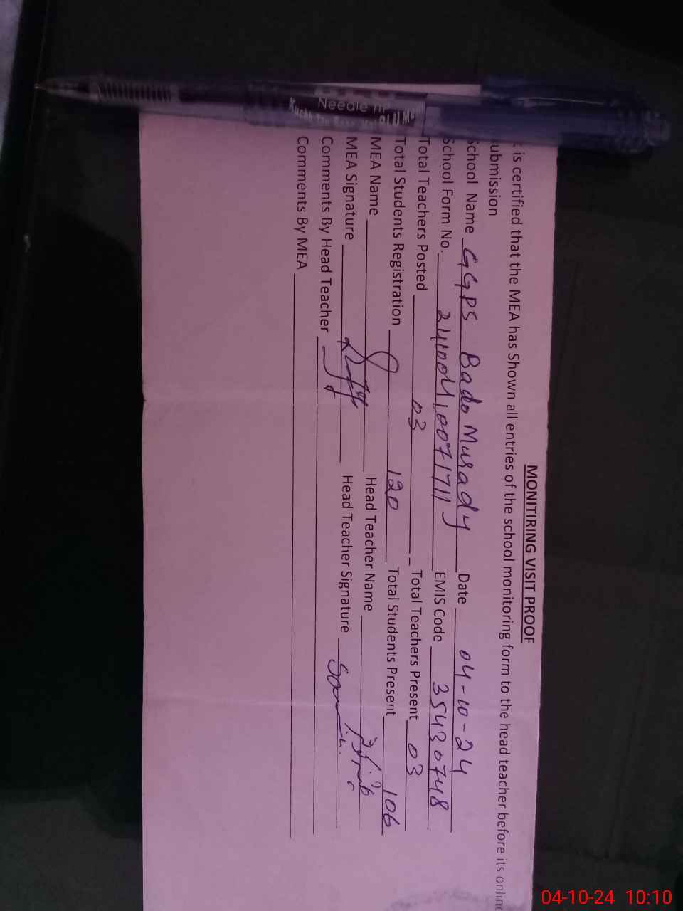 | Attendance Register | Head Teacher | MEA with School | Visit Proof |