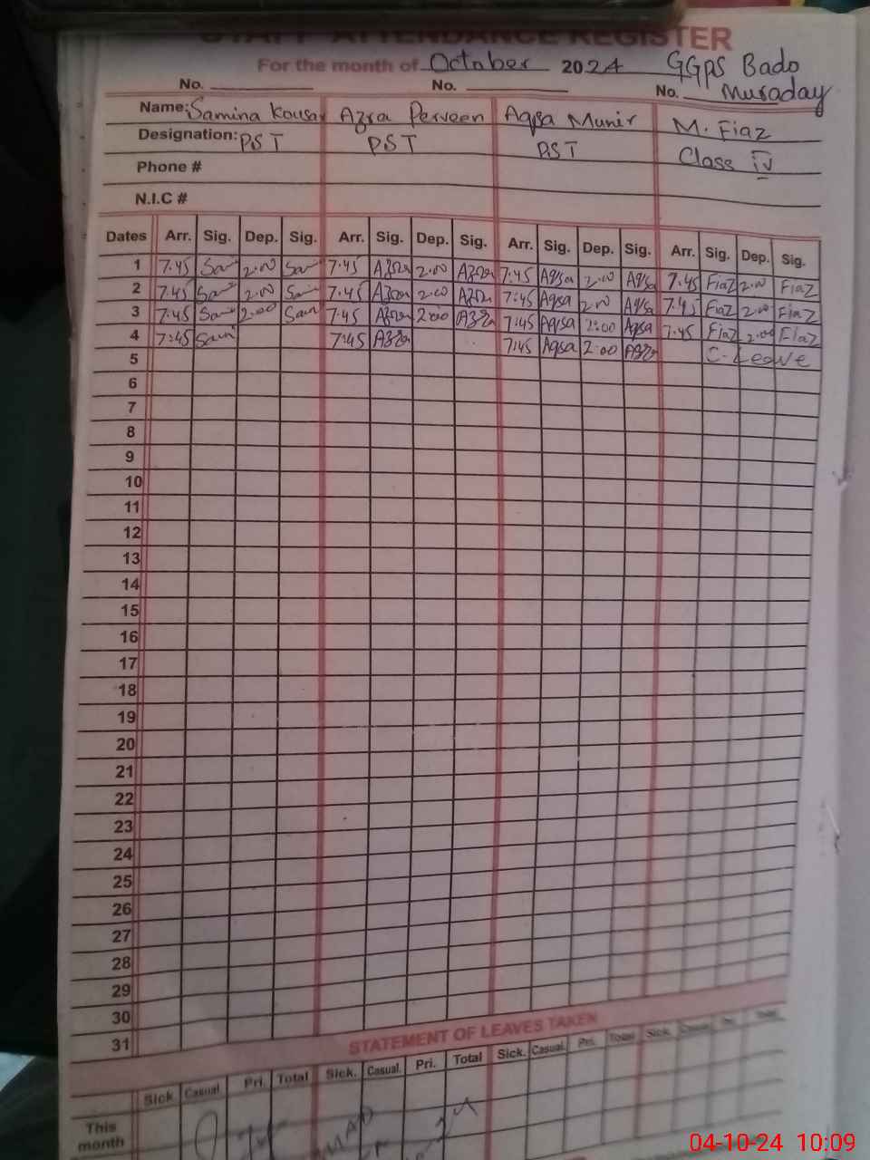 | CNIC | Full Name | Designation | R/C | Absence During Last Calender Month |