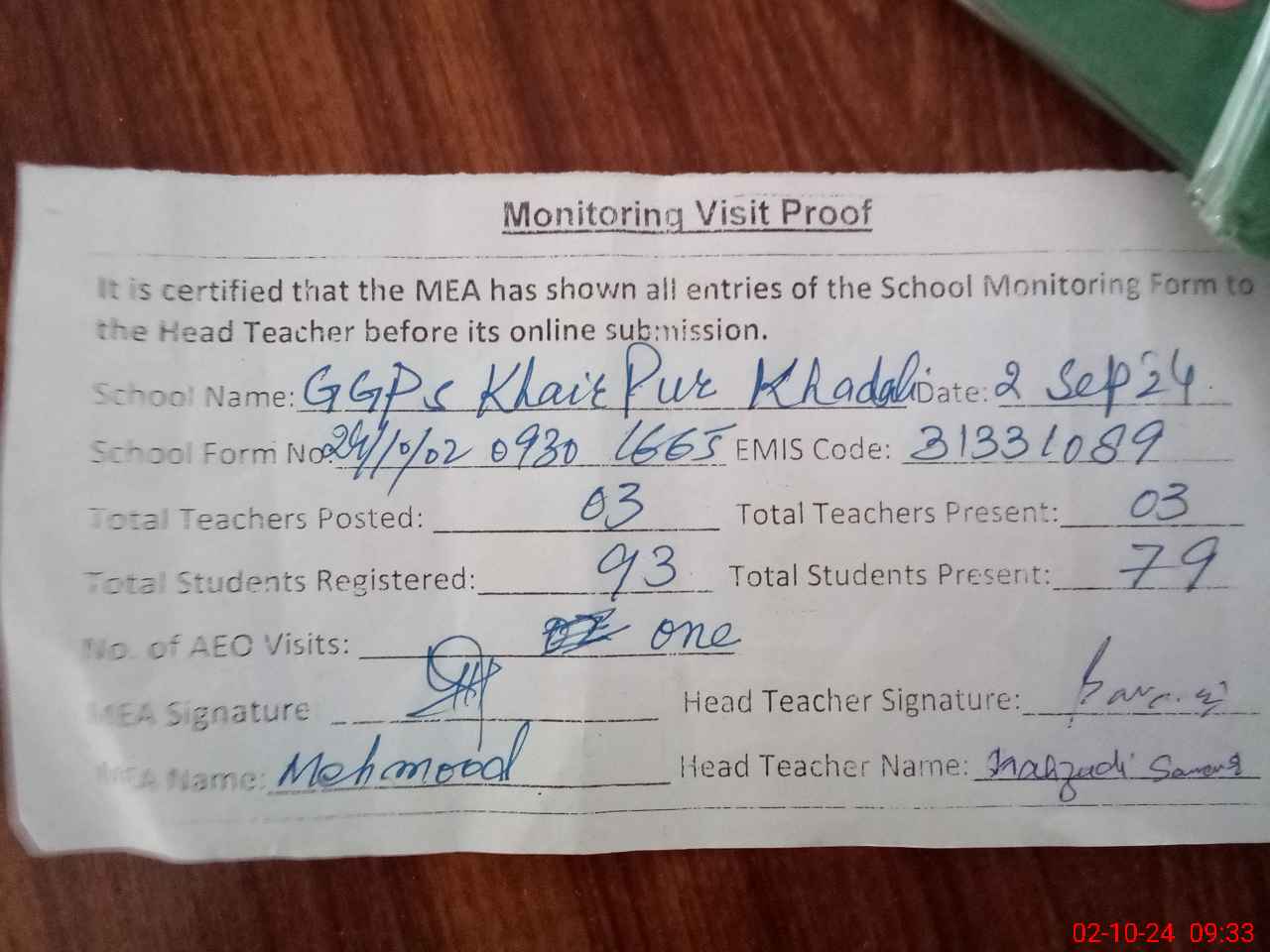 | Monitoring Date: 02-10-2024 | Start Time: 02-10-2024 09:15 AM | End Time: 02-10-2024 09:33 AM | Name of MEA: Ma**** UlHa**** | |