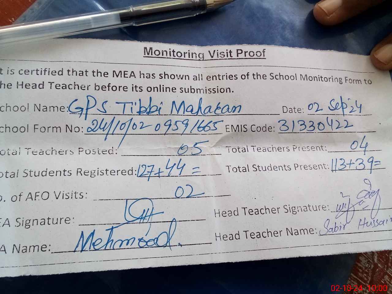 | Monitoring Date: 02-10-2024 | Start Time: 02-10-2024 09:42 AM | End Time: 02-10-2024 10:01 AM | Name of MEA: Ma**** UlHa**** | |