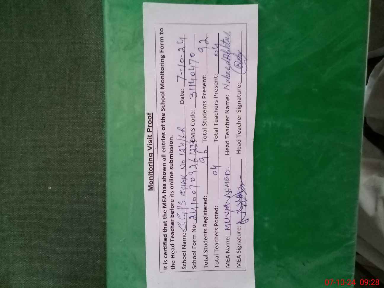 | Certified that this School was Inspected by the Undersigned MEA/DMO Today and the Information Stated Above is as Per Record. | |||||