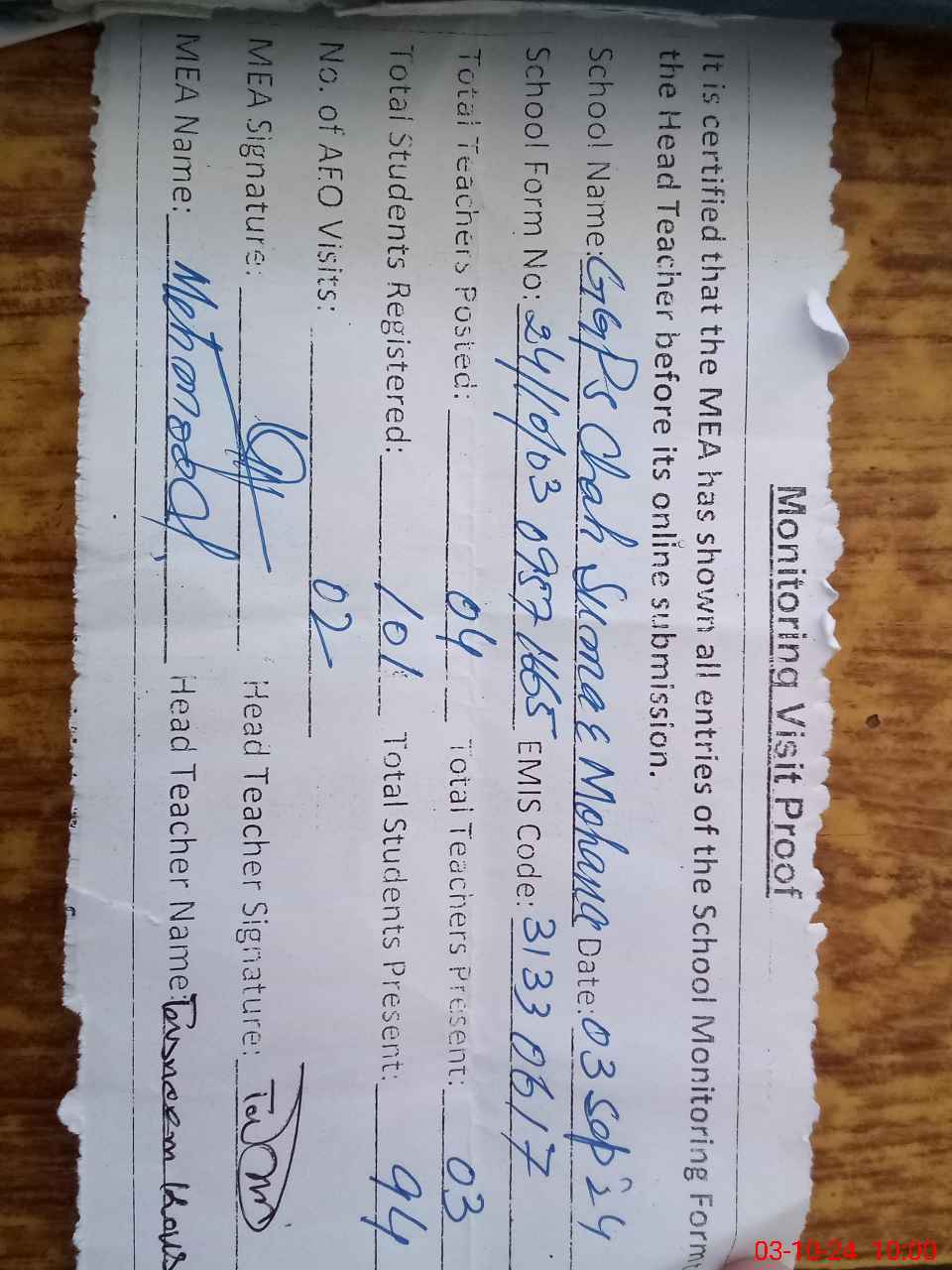 | Monitoring Date: 03-10-2024 | Start Time: 03-10-2024 09:40 AM | End Time: 03-10-2024 10:00 AM | Name of MEA: Ma**** UlHa**** | |