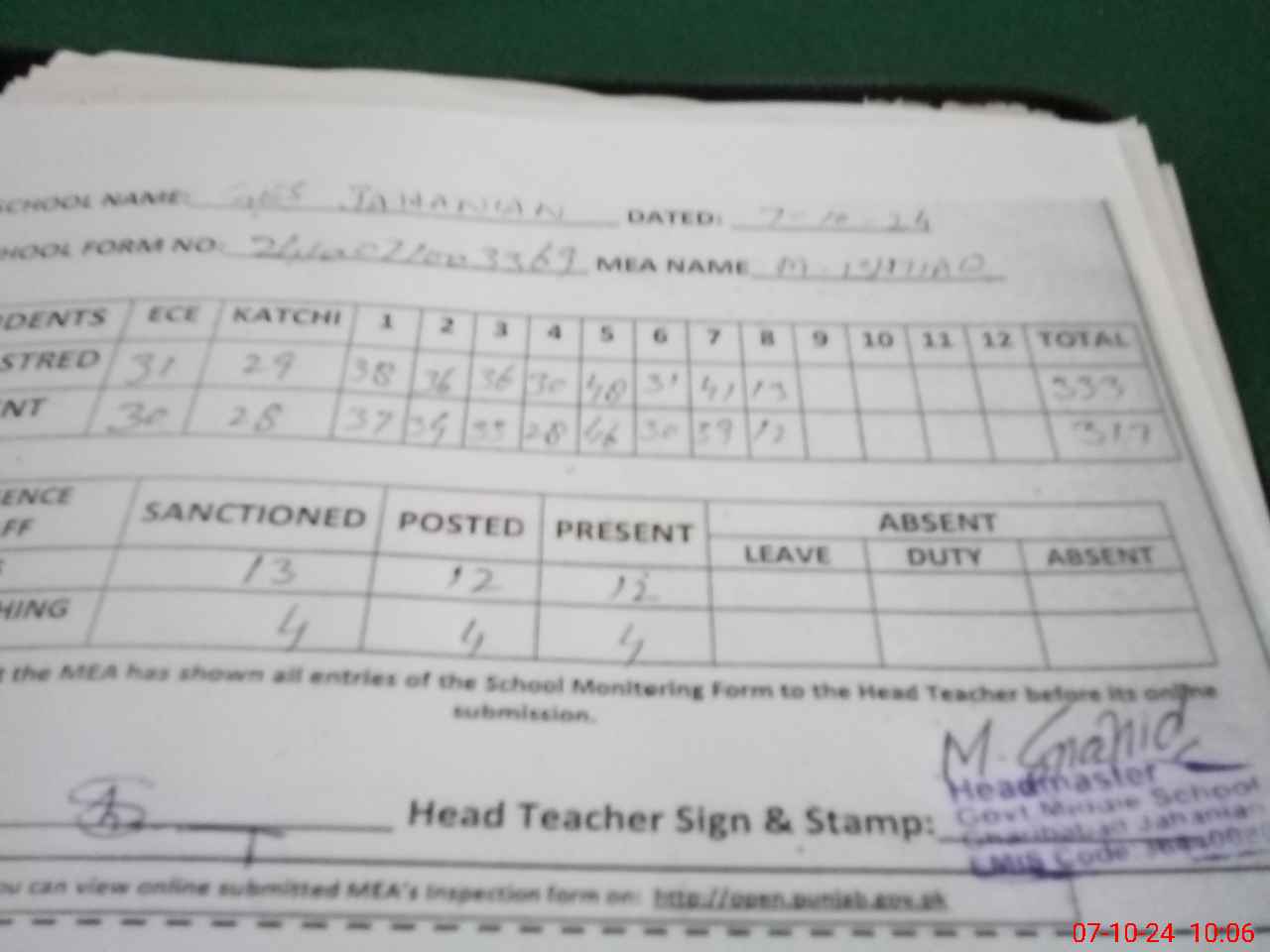 | Certified that this School was Inspected by the Undersigned MEA/DMO Today and the Information Stated Above is as Per Record. | |||||