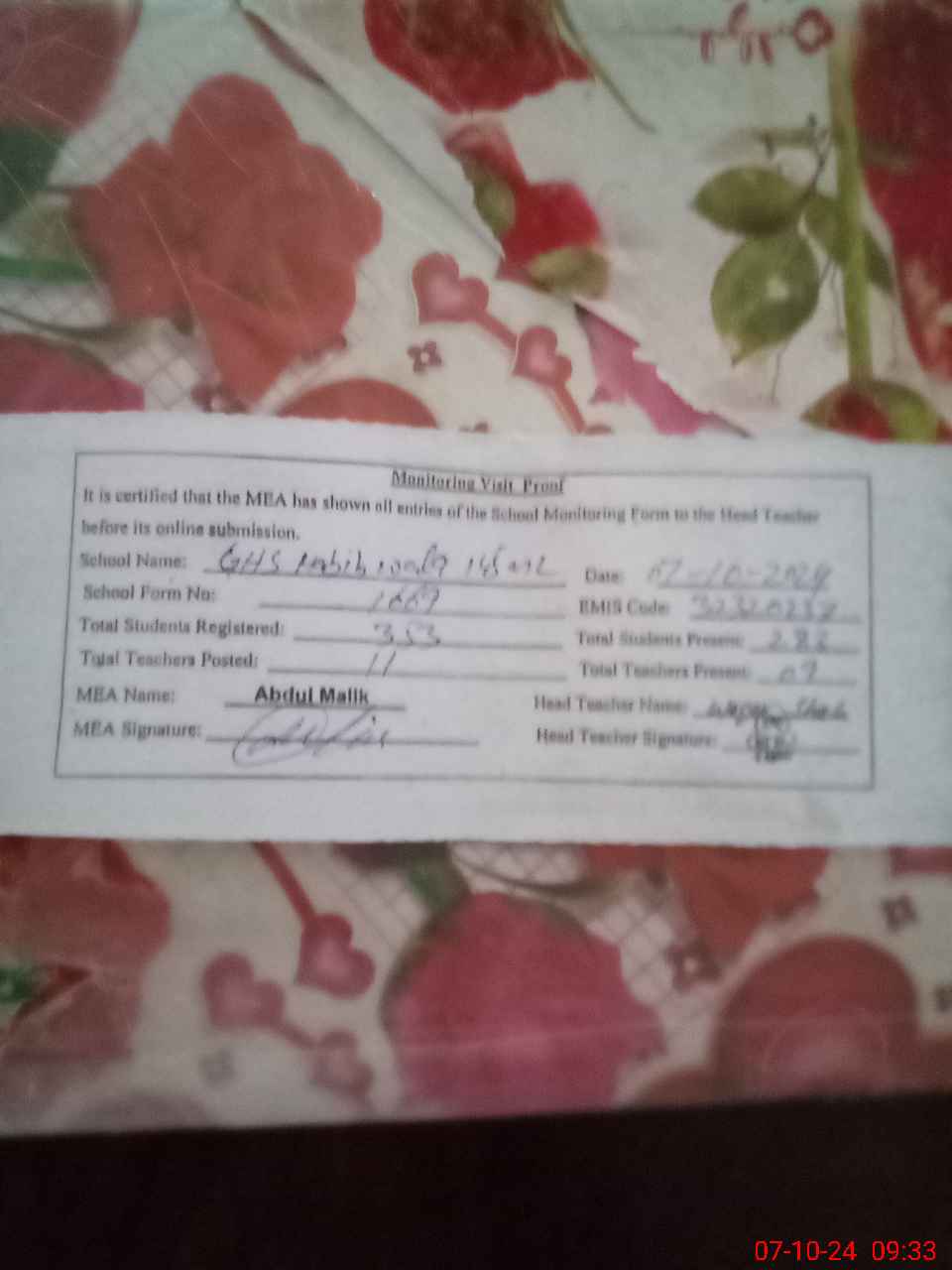 | Certified that this School was Inspected by the Undersigned MEA/DMO Today and the Information Stated Above is as Per Record. | |||||