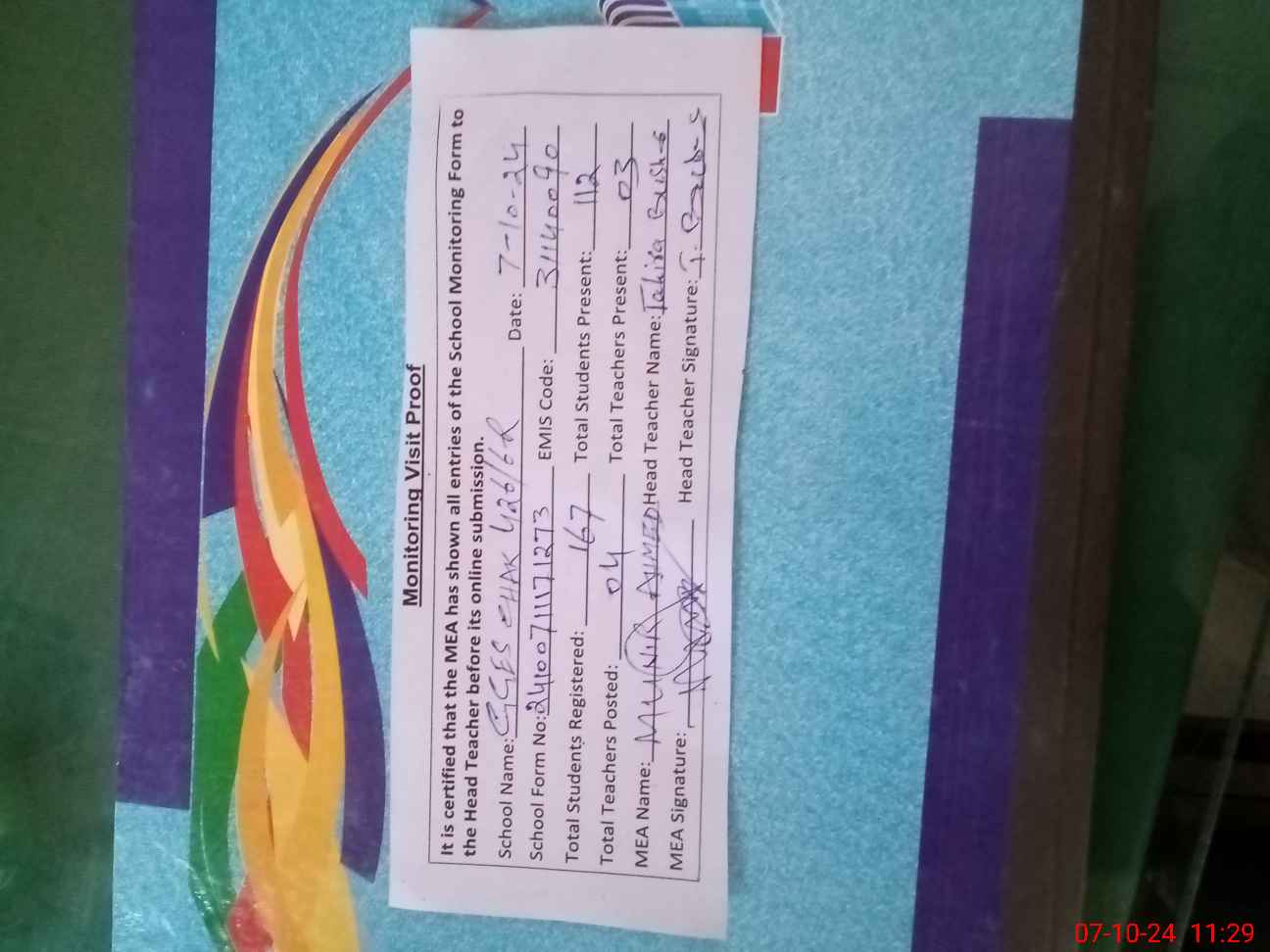 | Attendance Register | Head Teacher | MEA with School | Visit Proof |