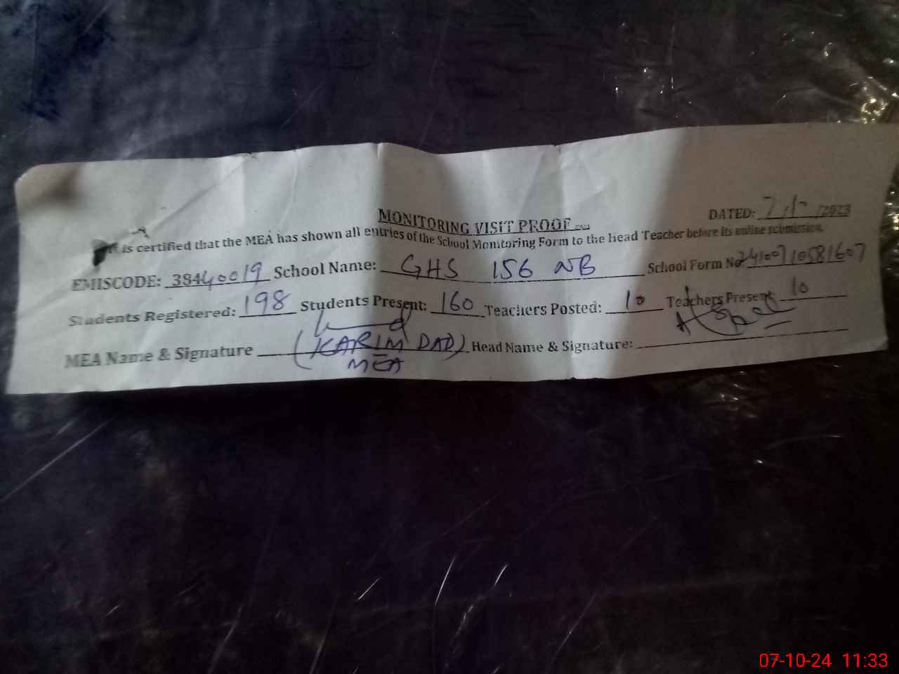 | Monitoring Date: 07-10-2024 | Start Time: 07-10-2024 10:58 AM | End Time: 07-10-2024 11:36 AM | Name of MEA: KA**** DA**** | |