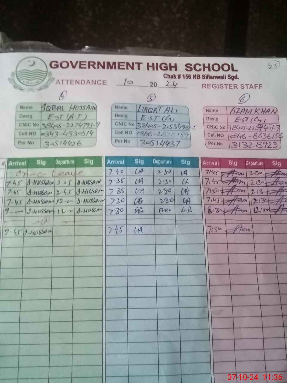 | CNIC | Full Name | Designation | R/C | Absence during last cal. month |