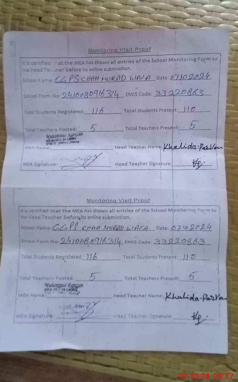 | EMIS Code: 33220863 | Name of School: GGPS CHAH MURAD WALA | |||