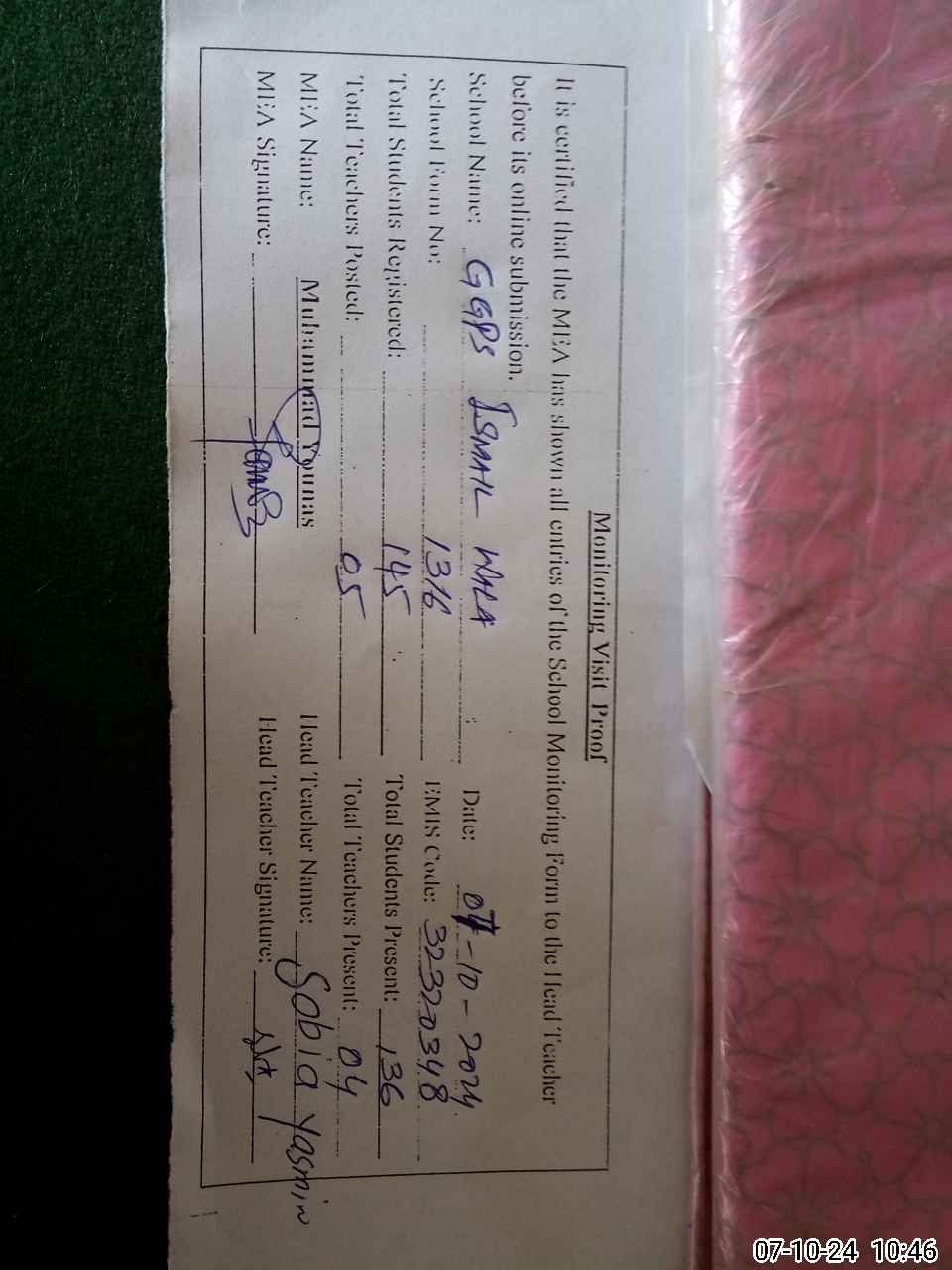 | Certified that this School was Inspected by the Undersigned MEA/DMO Today and the Information Stated Above is as Per Record. | |||||
