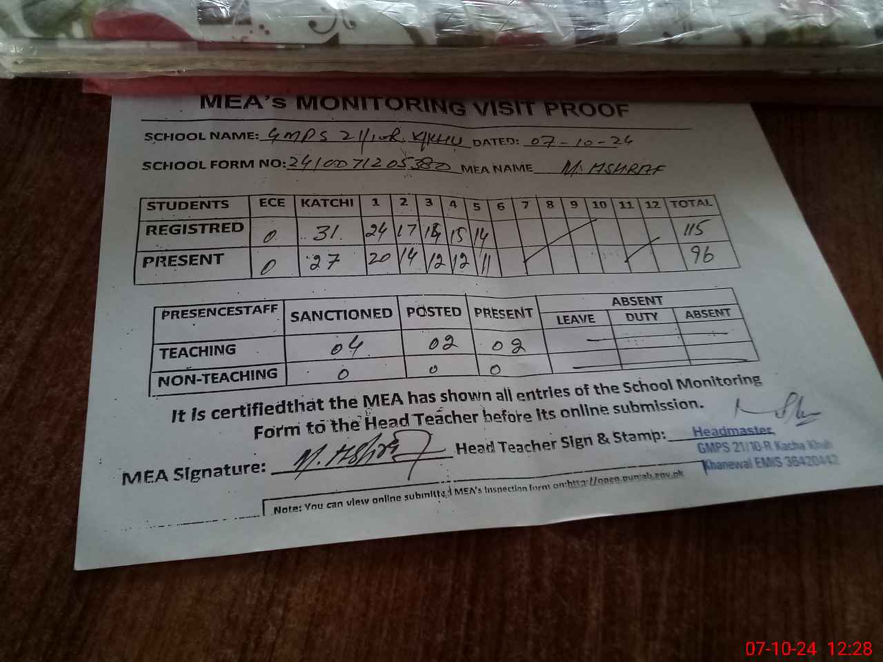 | Attendance Register | Head Teacher | MEA with School | Visit Proof |