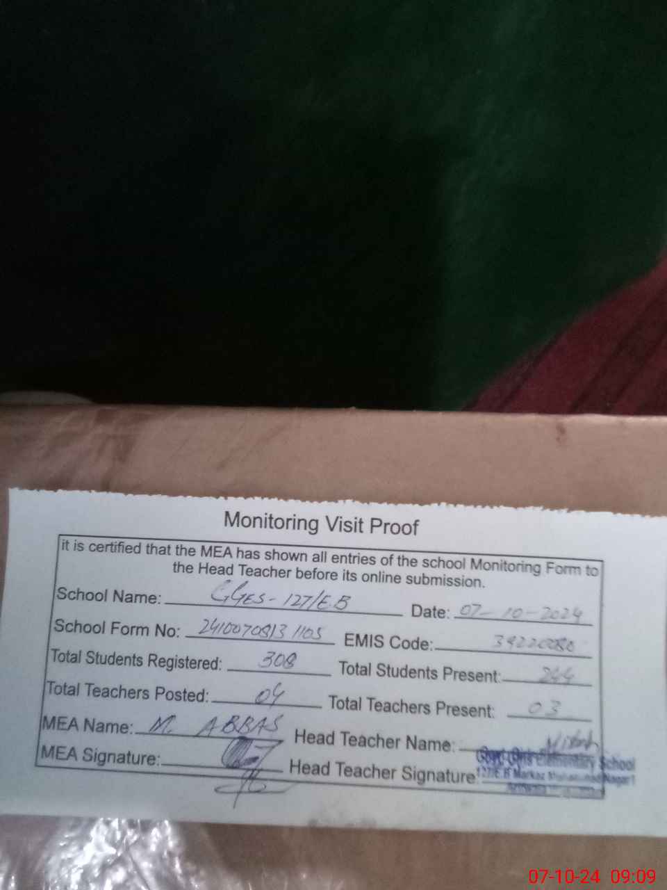 | Certified that this School was Inspected by the Undersigned MEA/DMO Today and the Information Stated Above is as Per Record. | |||||