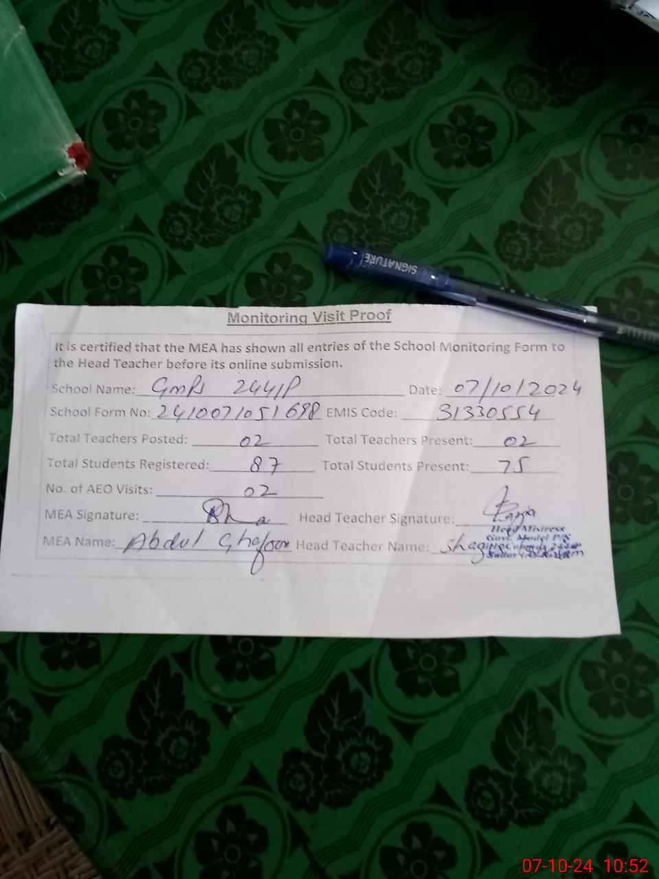 | Certified that this School was Inspected by the Undersigned MEA/DMO Today and the Information Stated Above is as Per Record. | |||||