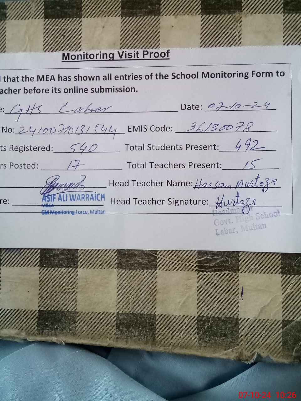 | Certified that this School was Inspected by the Undersigned MEA/DMO Today and the Information Stated Above is as Per Record. | |||||
