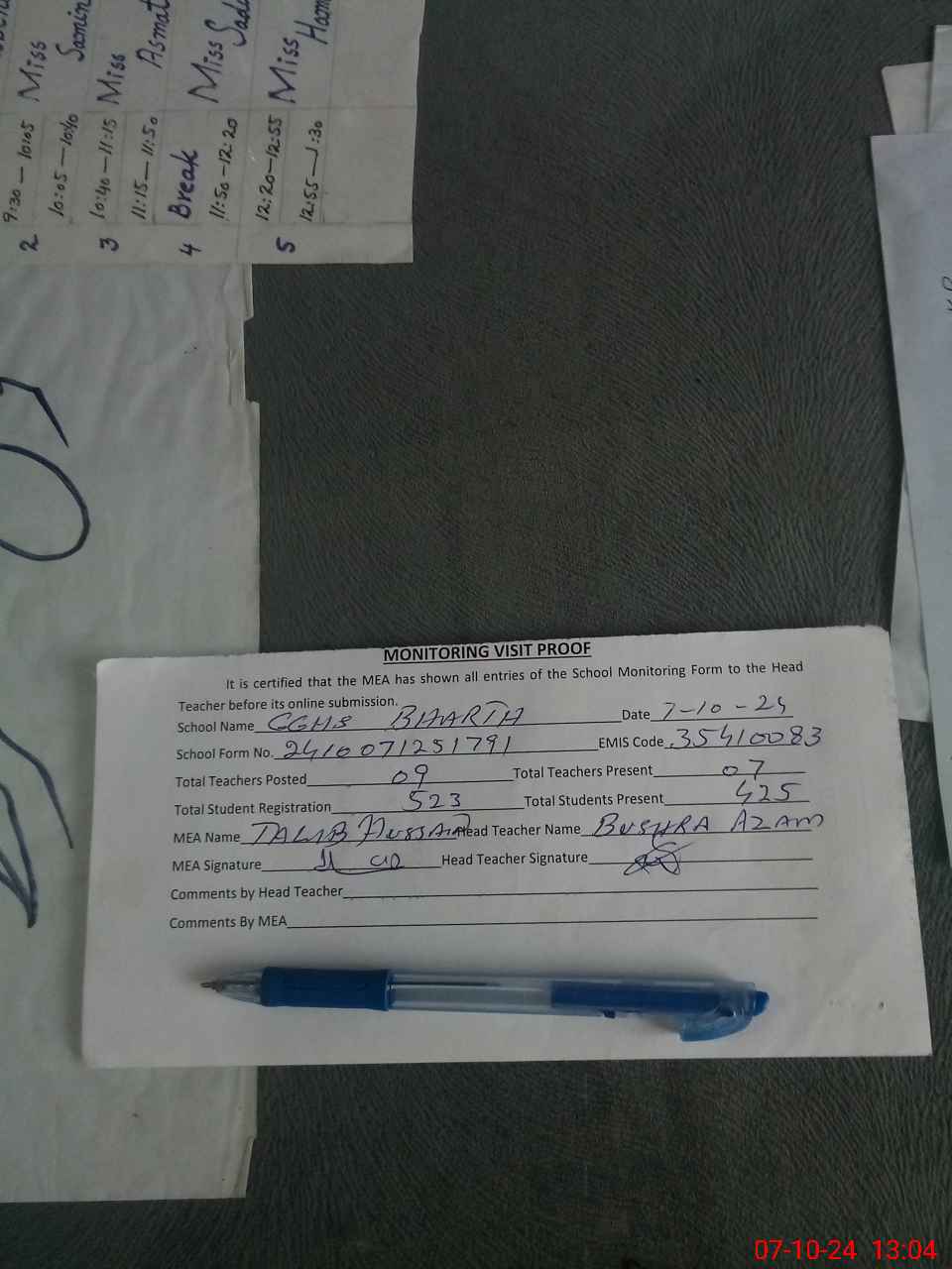 | Attendance Register | Head Teacher | MEA with School | Visit Proof |