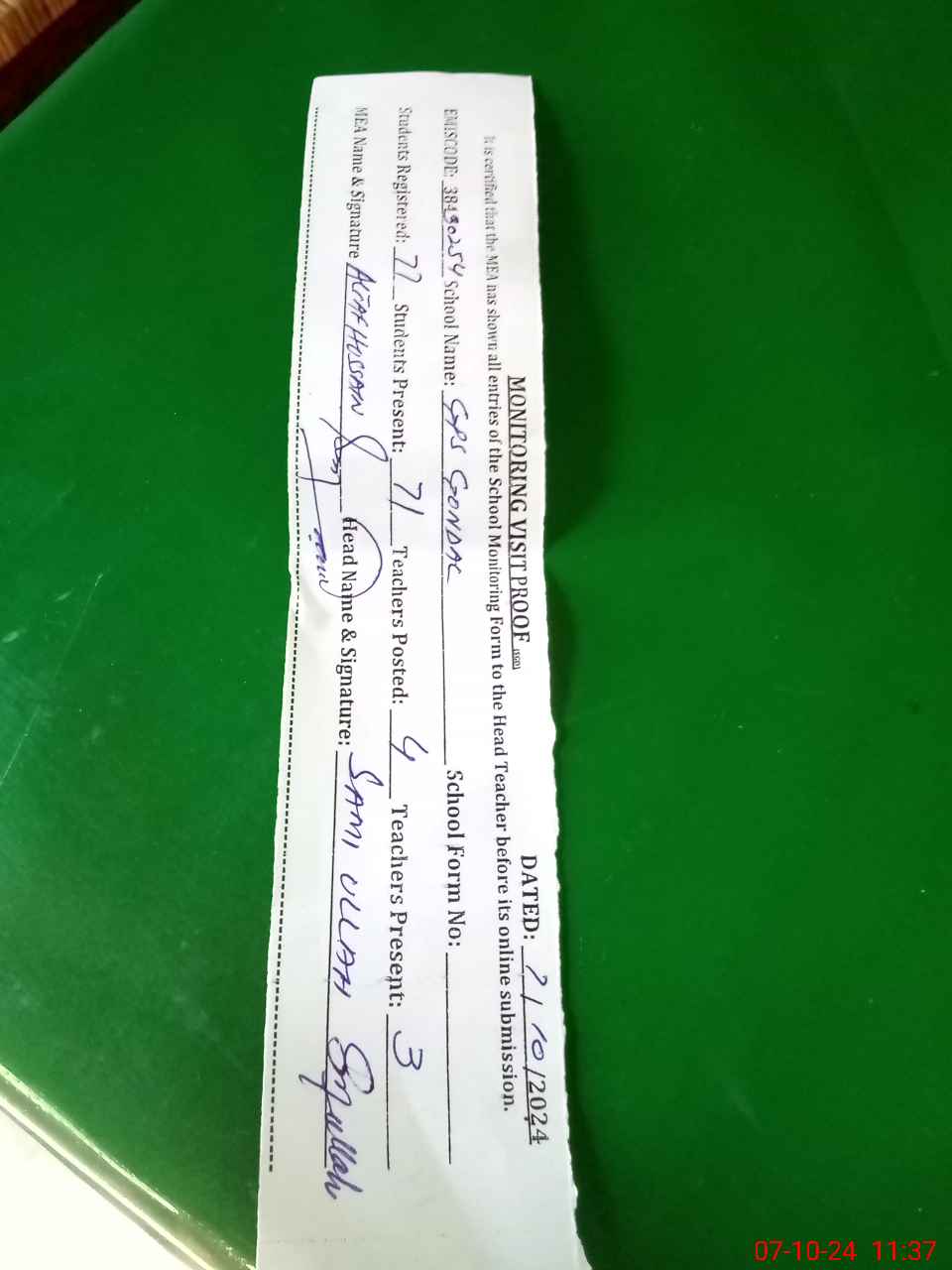 | Monitoring Date: 07-10-2024 | Start Time: 07-10-2024 11:11 AM | End Time: 07-10-2024 11:37 AM | Name of MEA: AL**** HU**** | |