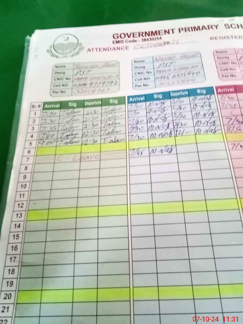 | CNIC | Full Name | Designation | R/C | Absence during last cal. month |