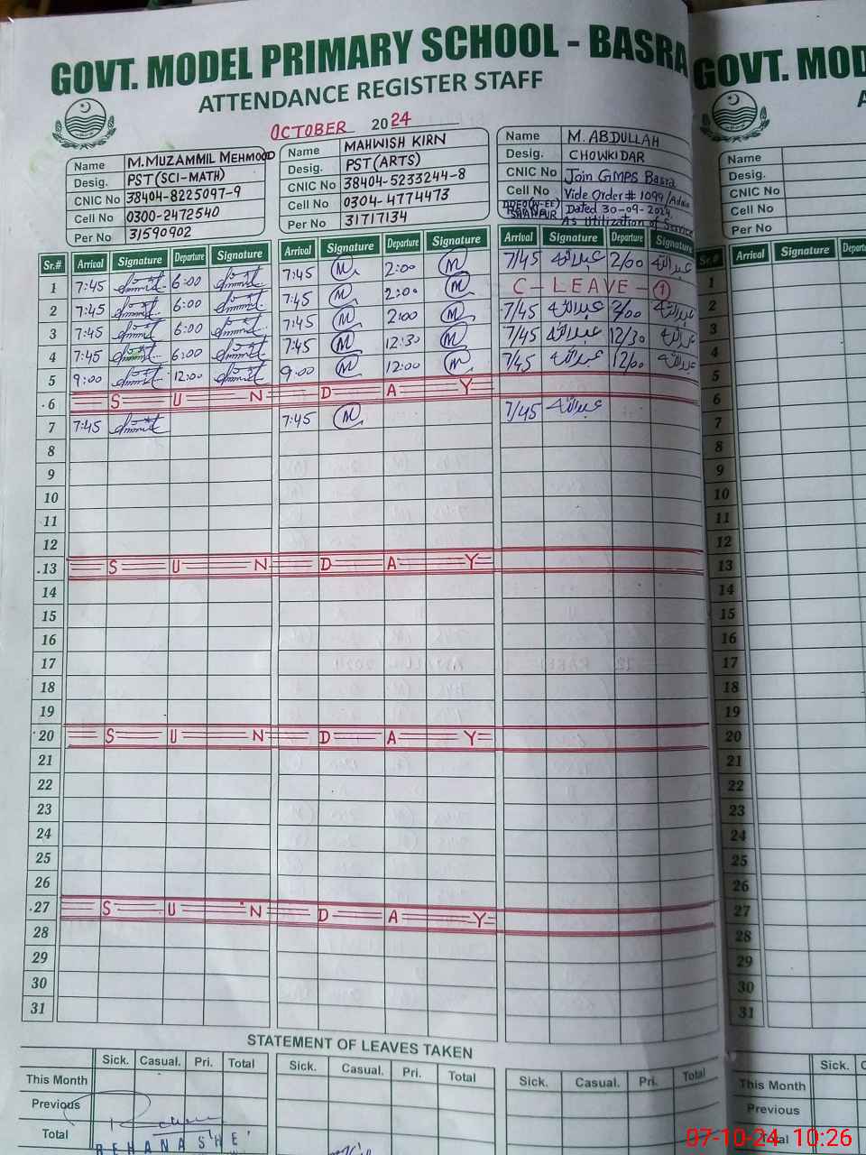 | CNIC | Full Name | Designation | R/C | Absence during last cal. month |