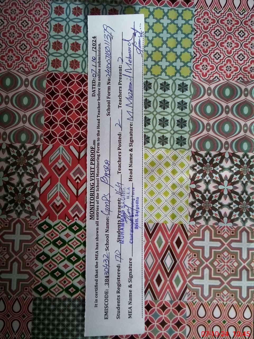 | Certified that this School was Inspected by the Undersigned MEA/DMO Today and the Information Stated Above is as Per Record. | |||||