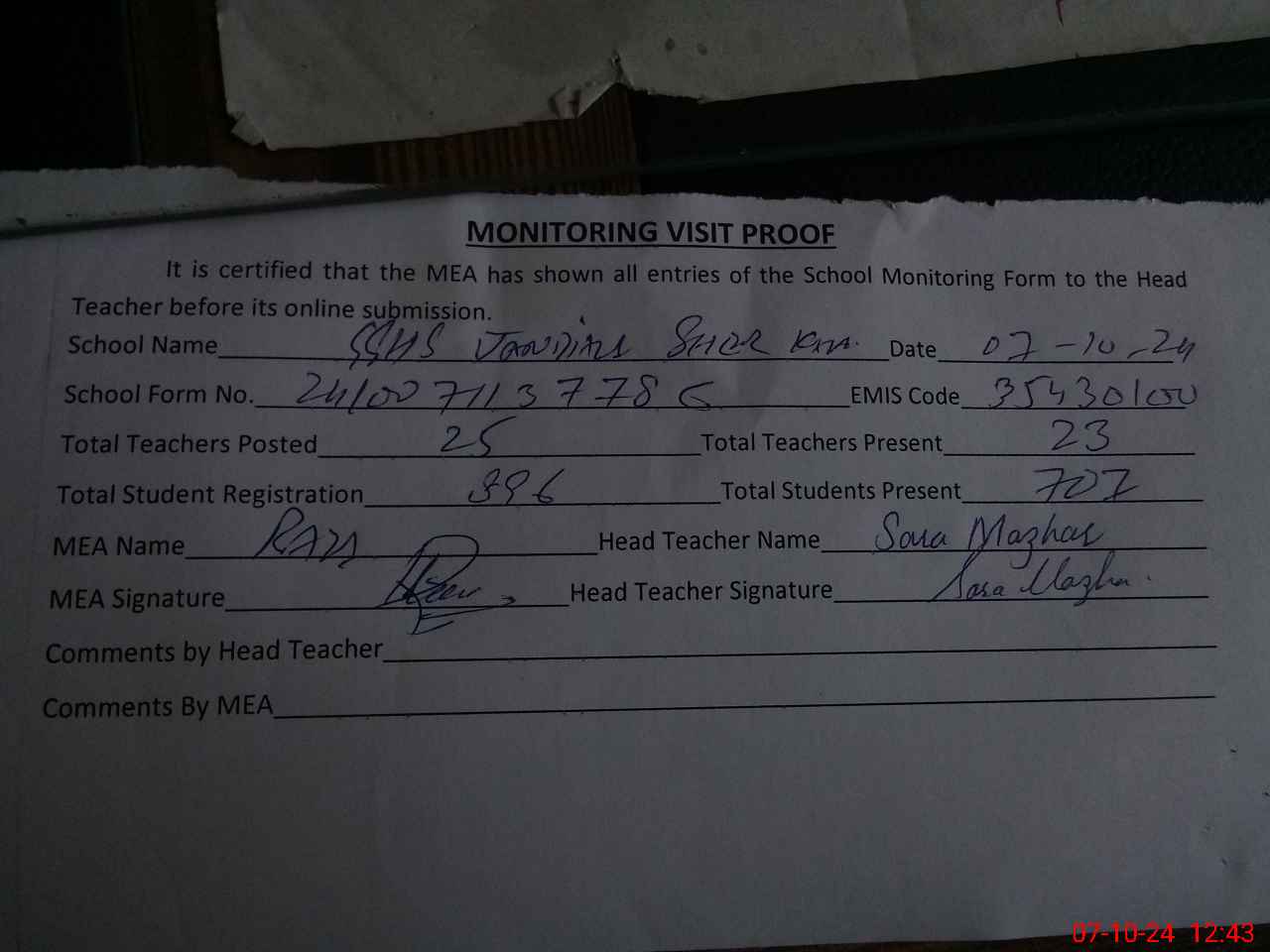 | Certified that this School was Inspected by the Undersigned MEA/DMO Today and the Information Stated Above is as Per Record. | |||||