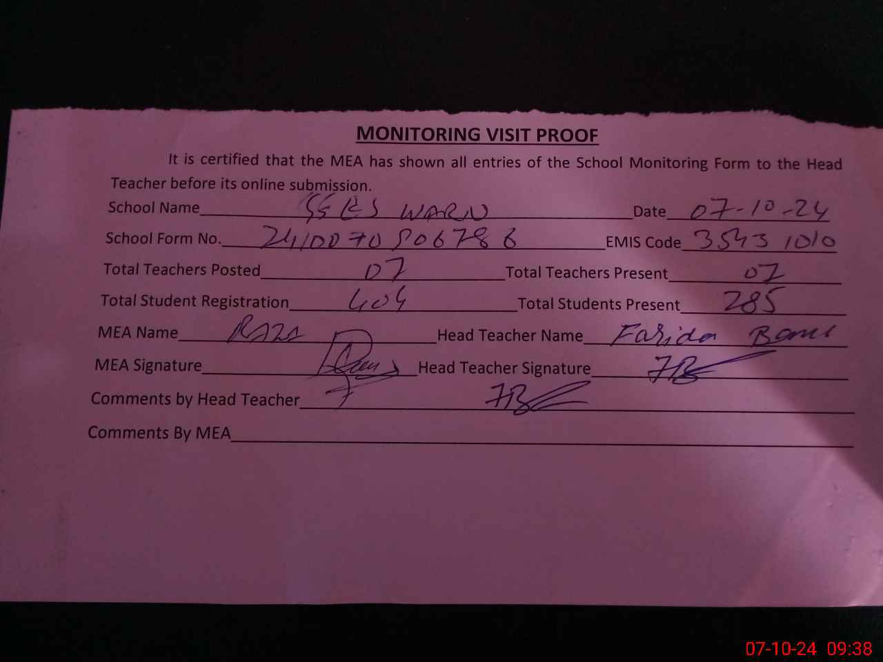 | Attendance Register | Head Teacher | MEA with School | Visit Proof |