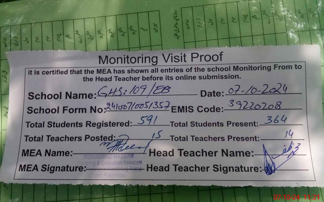 | EMIS Code: 39220208 | Name of School: GHS CHAK NO. 109/ EB | |||