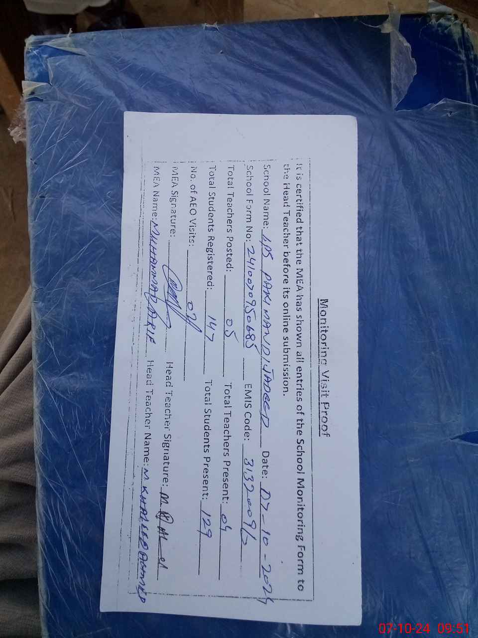 | Certified that this School was Inspected by the Undersigned MEA/DMO Today and the Information Stated Above is as Per Record. | |||||