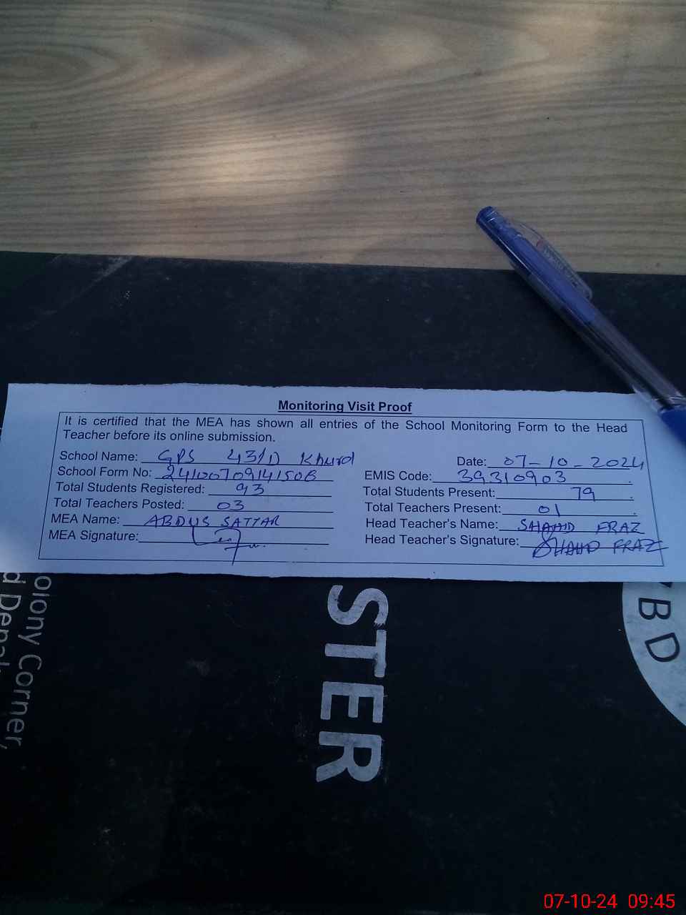 | EMIS Code: 39310903 | Name of School: GPS CHAK 43 D KHURD | |||