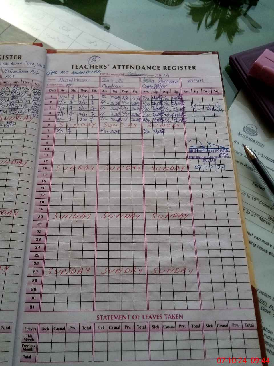 | CNIC | Full Name | Designation | R/C | Absence During Last Calender Month |