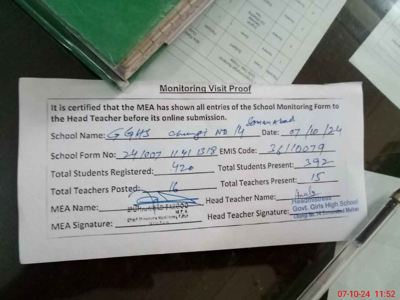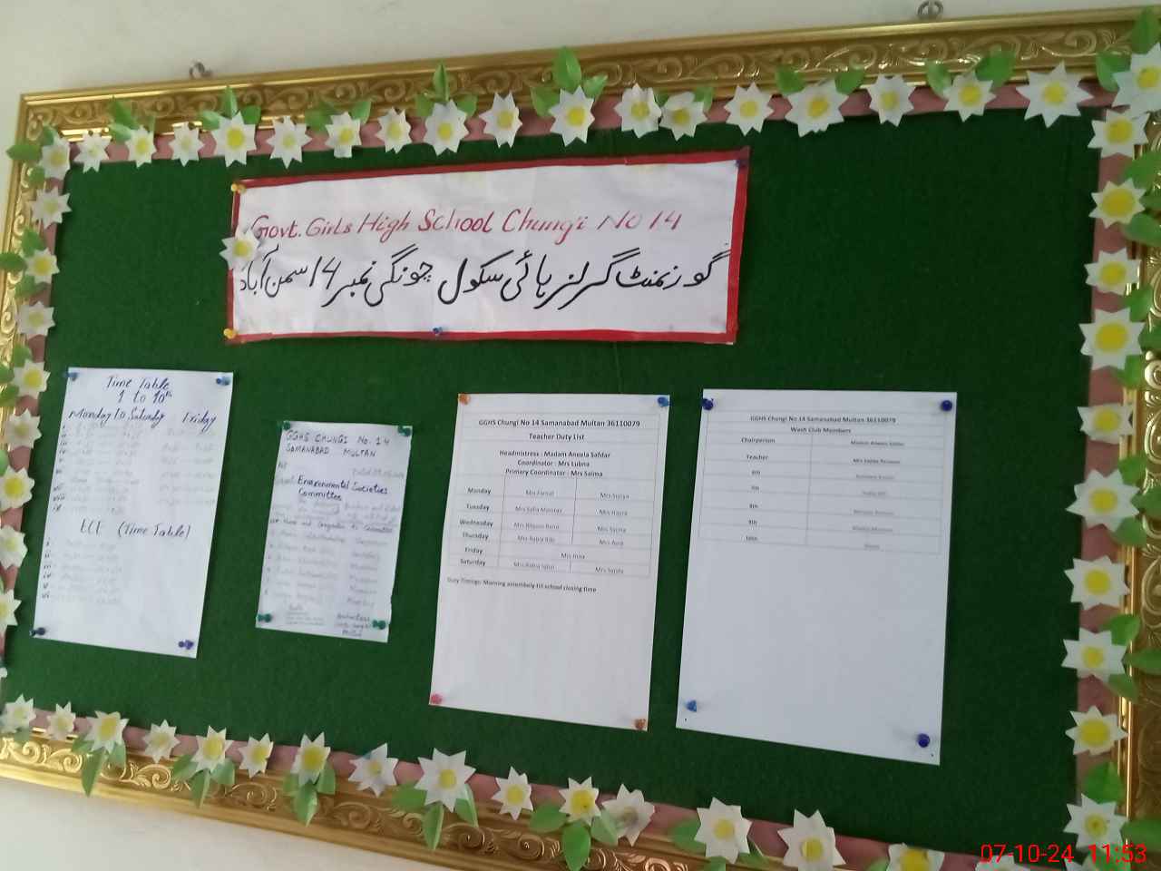 | EMIS Code: 36110079 | Name of School: GGHS CHUNGI NO. 14 SAMANABAD MULTAN | |||