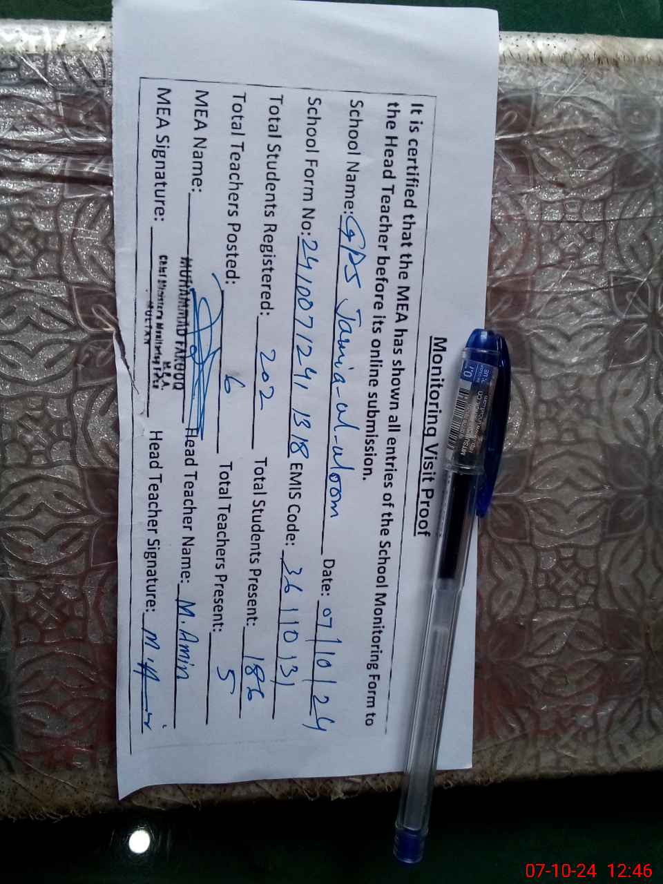 | EMIS Code: 36130131 | Name of School: GPS JAMI UL ALOOM DOULAT GATE MULTAN | |||