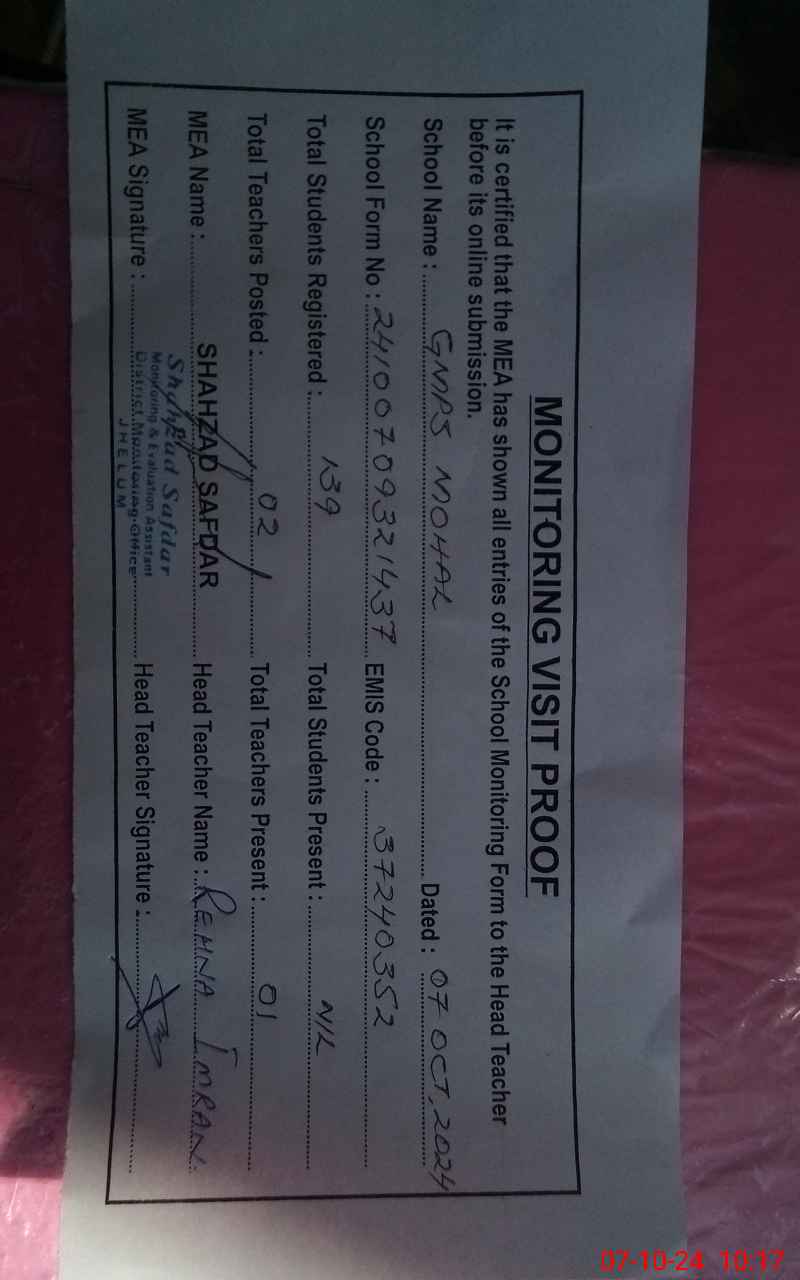 | EMIS Code: 37240352 | Name of School: GMPS MOHAL | |||