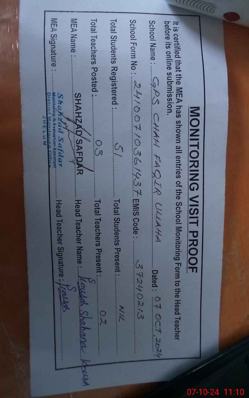 | EMIS Code: 37240213 | Name of School: GPS CHAH FAQIR ULLAHA | |||